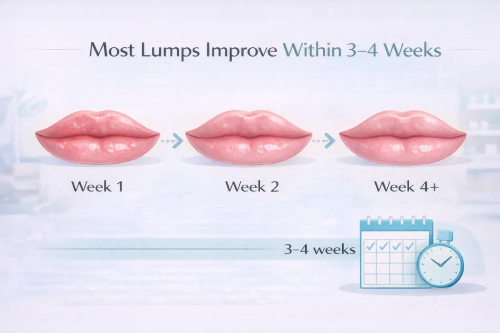 In clinical practice, it is very common for lips to feel uneven for several weeks after filler treatment. Most mild lumps settle naturally as swelling reduces and the product integrates with the tissue.
