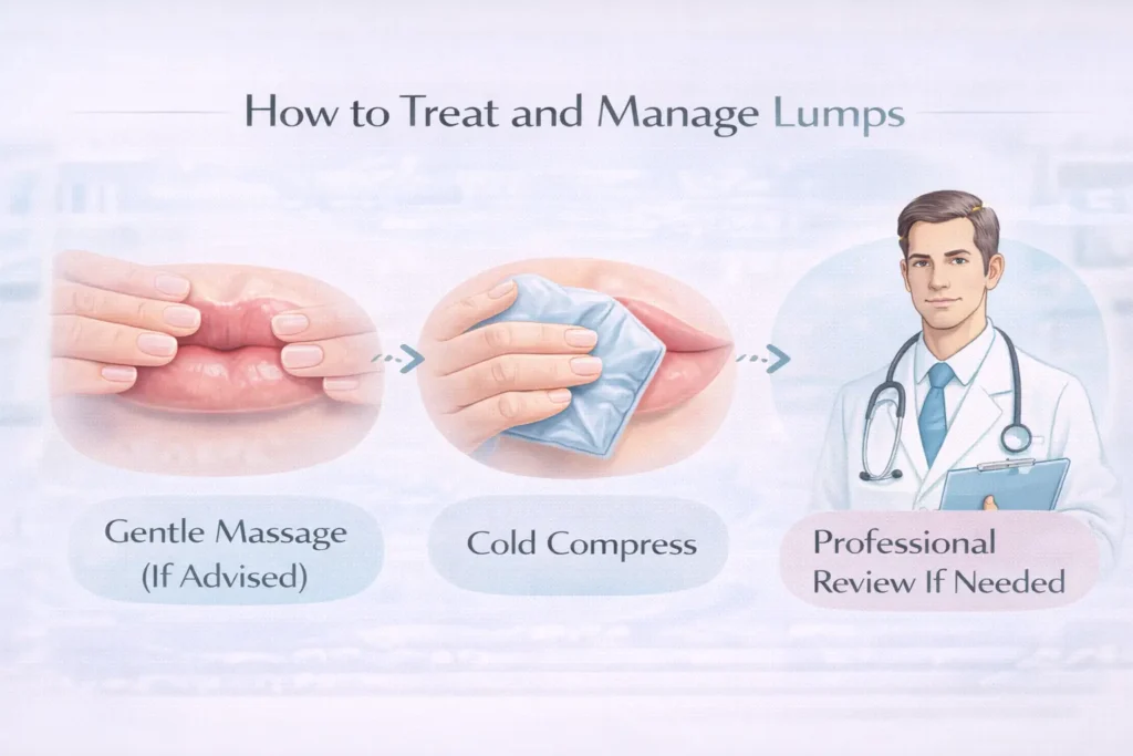 If you want to reduce the appearance of lumps, gentle massage should only be performed if specifically advised by your practitioner. Incorrect or aggressive massage can worsen swelling or move filler unevenly. When in doubt, professional guidance is safer than self-treatment.