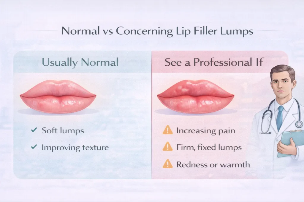 Most post-filler lumps are temporary and improve as swelling settles. Lumps are typically considered part of normal healing if they: